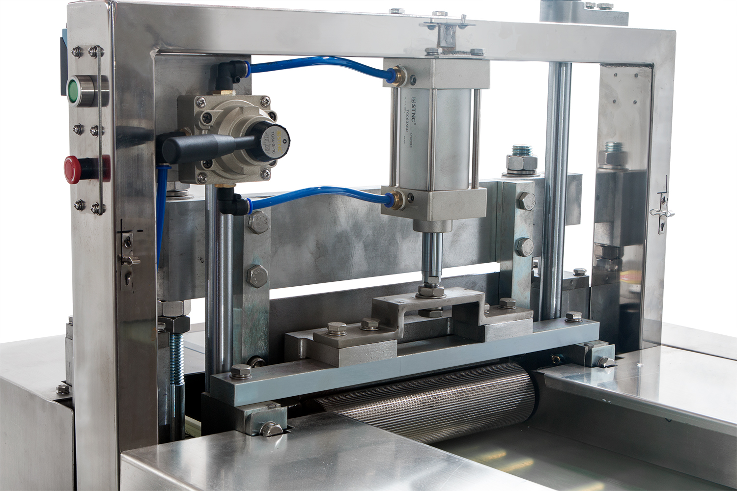 特制的輸送帶和壓料機構(gòu)將物料按設(shè)定的長度,作步進平行移動,垂直上下往復(fù)運動的切刀機構(gòu)直接在輸送帶上切斷物料。